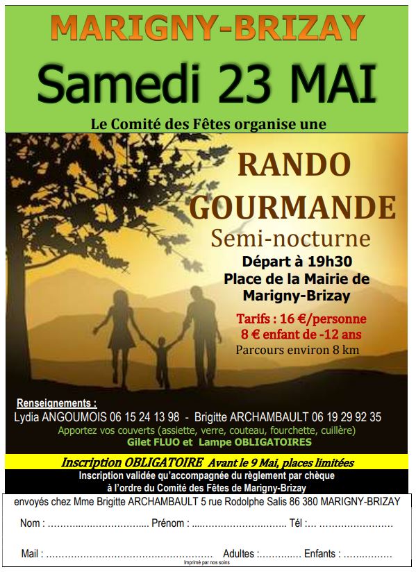 Le Comité des Fêtes de Marigny-Brizay organise le samedi 23 mai 2026, une Randonnée Gourmande Semi-Nocturne à Marigny-Brizay